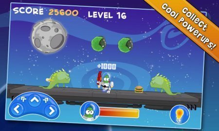 Bert In Space -- красочная аркада на андроид систему, о перемещениях небольшого инопланетянина по прозвищу Берта. По вредной случайности Берт не успел на космическое судно, на котором ему необходимо было лететь с родными отдыхать. Оставшись на площадке станции, ребенок кинулись преследовать озлобленные инопланетные прыгуны. Но данный персонаж не опустил руки, а удрал. Укрывшись, герой нашел старейший скафандр-доспех, в котором так же было и орудие, и двигатель. Не долго рассуждая, персонаж надевает костюм на себя и принимает решение стать борцом с противными пришельцами, дав себе прозвище при этом Бертонатор. Вот такие занимательные приключения ожидают тебя в данном проекте. А также масса поощрений, различных задач и ведущая табличка.