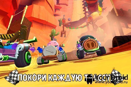 Спортивная гонка на маленьких картингах – интересно. Фанаты бешеной скорости, акробатических трюков на маленьких тачках и столкновений на трассе, воспользуются случаем, чтобы скачать Angry Birds Go на андроид с многоуровневым режимом, обновлениями и чемпионскими титулами. Бросьте вызов свиньям, установив игру энгри бердс – имитатор безудержной скорости для android планшетов без регистрации.