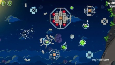 Принципиально серия космических приключений птиц не сильно отличается от классической игры, где наши герои бьются со свиньями. Используйте рогатку так, чтобы выстрел птицей поражал как можно большую площадь конструкции, на которой заседают зеленые свиньи. Отдельным элементом сюжета является гравитация, добавленная разработчиками в соответствии с действующим законом физики. Прицеливаясь птицей в свиней, будьте внимательны к расчету траектории, учитывайте воздействие космической гравитации и настильность.