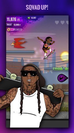 Lil Wayne: Sqvad Up – хороший раннер на систему андроид, в котором ты возьмешь под свое руководство популярного музыканта - Лил Уэйн и всю его группу. В данной игрушке ты будешь руководить персонажем, который движется на собственном скейтборде по тропинкам Нового Орлеана и исполняет разносторонние маневры. Перемещайся по трипам городка на высокой скорости и демонстрируй интересные трюки, уклоняясь от разнообразных преград. Подлетай в небо, поднимая на собственной дороге дрона который летает. По дороге не пропускай золотые монетки, которые поспособствуют в раскрытии твоим персонажем иных героев и получить еще и новенькие скейтборды. Игрушка принесет радость не только представленных харизматичным персонажем, но и массой приготовленный миссий, разносторонними усилениями и простым руководством.