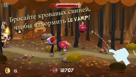 Le Vamp – интересная аркадная игра для андроид. Действующее лицо – крохотный вампиреныш, идущий по враждебному лесу. На его пути встречается масса опасностей и преград, поэтому ваша помощь будет очень кстати. Потрудиться придется много, ведь для продолжения пути нужно пилить деревья, строить мост. Не следует забывать и о том, что малышу необходима защита от солнца, да и силы восполнить он сможет, если вы его покормите молоденькими хрюшками. А еще вам придется сражаться с недругами и коллекционировать бонусы. Так что приятные игровые моменты гарантированы! Русский язык: отсутствует. Процесс установления на внешнюю SD карту: отсутствует.