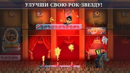 Stage Dive Legends – Игра поможет окунутся в мир великолепных турне, для проведения своего рок-концерта. Вы можете не только принять участие в самом рок-концерте, но и даже прыгнуть со своего пьедестала, разбить в дребезги свой музыкальный инструмент. Это море эмоций, поднимет вам настроение. Почувствуйте любовь своих поклонников, почувствуй себя серфингистом, и прокатись по концертному залу. Собирая монеты, выполняй умопомрачительные трюки, доставь удовольствие присутствующей толпе. Но не забывайте, уклоняться от посторонних летающих предметов, например, еды. Игра очень легка в управлении, что помогает получать от игры большее удовольствие. Данная раннер игра, поднимет любое настроение. Но не забываем и про рейтинг, ведь улучшая своего персонажа вы можете улучшить свой результат, таким образом победить. Совершенствуй прыжки со сцены и стань легендой. Русскоязычная версия игры отсутствует.