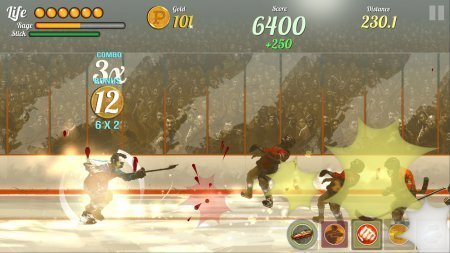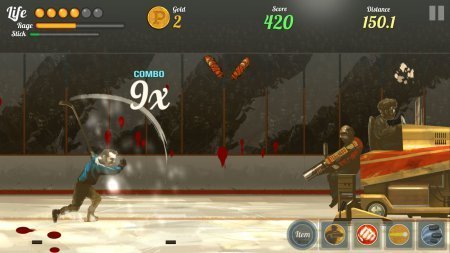 Super Puck Jam – интересный раннер на системе андроид, с шустро развивающимися действиями и графической обработкой в облике семидесятых годов. В данной игрушке ты будешь руководить смелым хоккеистом, который самостоятельно принял решение кинуть вызов всей команде игроков и не дружелюбно настроенным болельщикам. Руководи представленным хоккеистом благодаря одному пальцу и обходи все представленные преграды на собственной дороге в облике пролетающих бутылок, гамбургеров и прочих хоккеистов. Перемещайся только к необходимой цели и закали собственный характер, противостоя группе и серьезным главарям. Заработай больше золота и раскрой для собственного персонажа плюсовые умения и конкретные атаки.