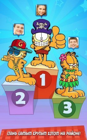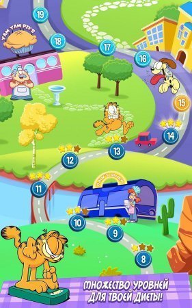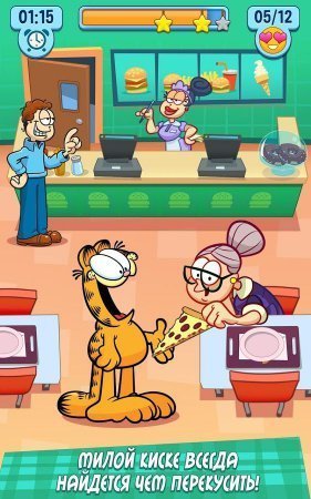Garfield: Cheat & Eat! – необыкновенно позитивная игра, вам нужно помочь знаменитому коту Гарфилду, красть еду в различных кафе и ресторанах. Все это происходит не просто так, а все потому, что хозяин котика сел на диету, начал правильно питаться, и коту ничего не дает вкусненького. После чего наш котик решил обворовывать всех клиентов пиццерий и закусочных, для того, чтобы оставаться самым пушистым и толстым котом на планете. Помогите Гарфилду пробраться на кухню к повару, в зал к посетителям и забрать у всех вкусности. За каждую украденную порцию вы будете получать определённое количество баллов, которые возможно потратить на покупку костюмов для котика. Повышайте свой рейтинг и будьте аккуратными. Русский язык: нет.