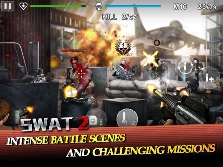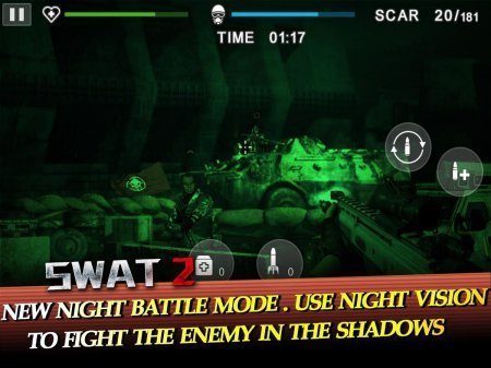 SWAT 2 – предлагаем твоему вниманию довольно качественный шутер на базе андроид, исполненный в облике тира. Тебя ожидает группа первоклассный бойцов, которым досталась роль наместников добра непосредственно против зла. Каждый новый день террористы усыпают мир страхом и паникой. И только твоя собранная группа может их усмирить. Твои сражения будут происходить в самых разнообразных странах, как ночью, так и утром. Еще игра приготовила шикарный перечень орудия и их улучшений. Игрушка не русифицирована.