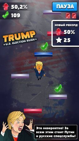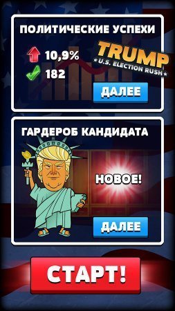 Trump. U.S. Election Rush –занимательная игрушка на системе андроид, в которой ты будешь принимать участие в гонке кандидатов на пост президента Америки. В данной игрушке ты будешь контролировать компанию президента миллионера по имени Дональда Трампа. В игрушке тебе необходимо думать и вообще мыслить как великий миллионер для того чтобы забрать максимум голосов своих избирателей и забрать желаемое место. Интересная президентская гонка – это довольно не самое простое задание в твоей жизни, и чтобы непременно обогнать противников и быть на пару ступеней выше их тебе необходимо думать, как реальный политик, быть дерзким и нахальным, чтобы забрать доверие миллионов, людей во всех штатах которые будут голосовать. Продемонстрируй все на что ты только способен и приведи собственного кандидата к желаемому результату. Игрушка русифицирована.