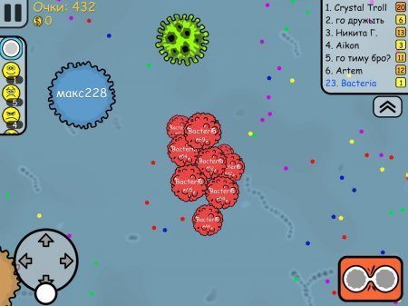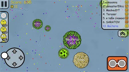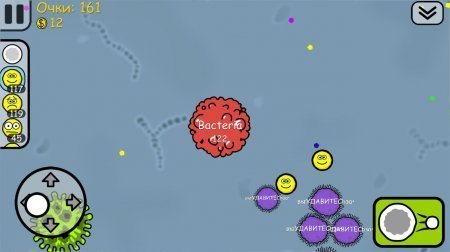 Bacteria World: Agar – интересное и занимательное приложение, позволяющее заглянуть в мир малых частиц и элементов, таких как бактерии и микробы. Это игра – увлекательная аркада, с оттенками стратегии, в которой нужно уметь мыслить логически и просчитывать ходы на шаг в перед. Задача, которую необходимо выполнить игроку это вырасти в самую большую бактерию, путем уничтожения более мелких собратьев. Но необходимо быть очень осторожными, так как на большую может найтись огромная бактерия, и сама среда полна неожиданностей. Для игры нужна усидчивость и терпение. В этой игре реализована возможность сражения с другими он – лайн игроками, для пользователей устройств на платформе андроид, результаты можно посмотреть в онлайн таблице победителей. Для устройств на андроид реализован мультиплеерный режим. Отсутствие русского языка.