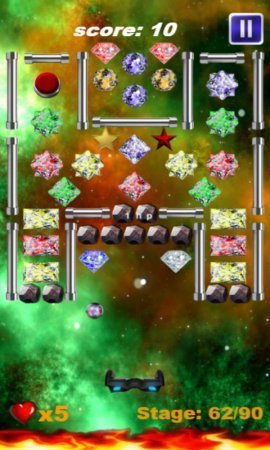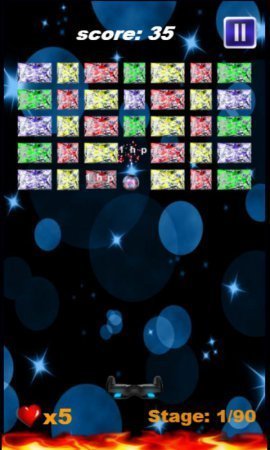 Break the crystals – хорошая экстремальная игра жанра арканоид для мобильного телефона. Отбивая мяч от платформы, нужно уничтожать кристаллы, одновременно собирая как можно больше бонусов. Уровень пройден, если разбиты все кристаллы. В качестве бонусов играющий получает лазерные пушки, плазменные шары, ракеты, которые облегчают прохождение препятствий. Продвигаясь по 90 уровням игры, вы будете участвовать в битвах с боссами. Особенностью игры являются захватывающие спецэффекты, оригинальная графика и электронная музыка. Русский язык не предусмотрен.