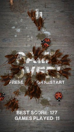В последний отрезок времени тайм-киллеров занимает все большую планку на устройства мобильного типа. И честно сказать создатели все чаще увы повторяются, применяя схожие либо даже целиком одинаковые задумки и параметры. Но иногда-таки возникают достаточно интересные проекты с абсолютно новенькими реализациями. так разработчики игрушки которую назвали Roaches Rush взяли на главу жизненную ситуацию. По линии сюжета если так говорить, то ты не очень-то и обеспеченный человек даже сказать бедный, да еще и совершенно одинокий. Как ты оказался в таком затруднительном положение легенда не говорит. Не менее грустно смотрится и твой сегодняшний ужин, который содержит в себе кусочек хлебушка, но как стало ясно его еще необходимо отбить, ведь группа тараканов того и смотри утянут и без слов скромную трапезу. Твоя цель прибить отчаянных насекомых таким образом спасая от них пищу, но не забывай, что в группе тараканов могут размещаться еще и довольно добродушные божьи коровки. Игрушка не русифицирована.