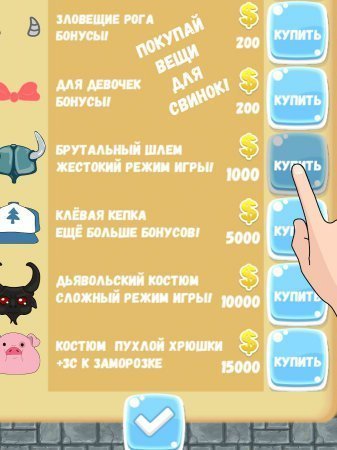 Save The Piggies – игра для андроид из разряда кликеров. Здесь вам нужно спасти всех хрюшек от неминуемой смерти. Главное тапать по экрану своего мобильного устройства как можно быстрее, чтобы успеть обеспечить безопасность каждой свинке и перенести с помощью телепортации ее в другое безопасное место. Многочисленные тапы позволят вам получить монетки, а чем их больше будет, тем скорее вы сможете открыть бонусы и прочие прибамбасы для упрощения игровой миссии. Красочные костюмы для поросят вы тоже сможете купить. А достижения и режимы, которые вы сможете открыть, будут все сложнее. Улучшайте свои результаты и соревнуйтесь с имеющимися лидерами. Русский язык: в наличии.