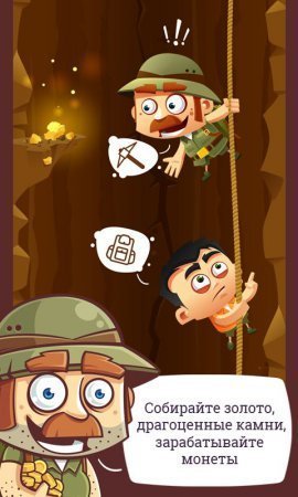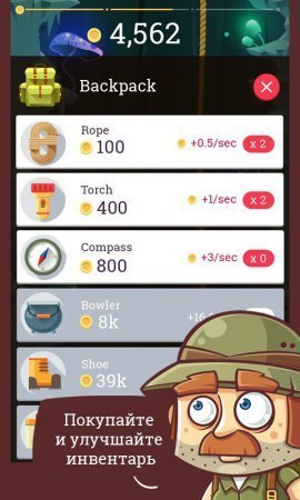 Golden Depth –шикарный кликер проект на системе андроид, где ты будешь помогать отчаянным исследователям, доставать золото. Данный смелый путешественник которого прозвали Свен Дук с собственным племянником проследовал изучать страшную пещеру, которая проведет в городок Зорга, где сохраняется большущий перечень золота, камней и прочих ценных артефактов. Данный исследователь набрал целую карту данного местечка и без лишней сложности способен отыскать выход в старинный городок. Поднимайся с каждым разом выше по представленному разлому и не пропускай золото на собственной дороге, не оставляя после себя ни одного кусочка, а еще обивайся от противников и доставай нужные тебе ресурсы. Твоя единственная цель тапать по дисплею устройства и поднимать золото. На полученное золото покуй для себя веревку, пищу, фонарик, компас и не только это, а все что нужно для снаряжения, которые понадобиться тебе в дороге. Игрушка русифицирована.