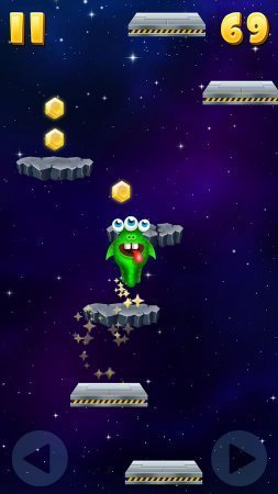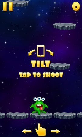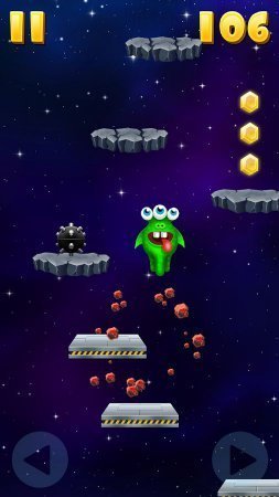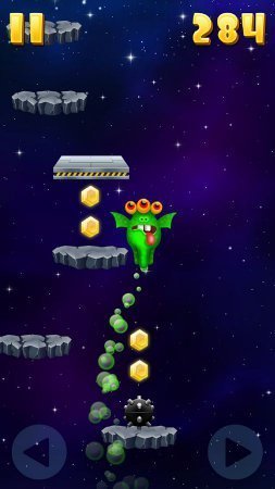 Monster Jump: Galaxy – веселенькая аркада джампер, про красочного, зеленого инопланетного существа прыгающего по предложенным платформам постоянно выше и еще выше. На твоей дороге будут разносторонние преграды в облике падающих красочных метеоритов, от некоторых из них нужно очень шустро уклоняться, в противном случае тебя ждет верная гибель и твой зеленый герой пропадет. Игрушка поддерживает акселерометр. А вот руководство достаточно простенькое, перемещай устройство из бока в бок и таким образом будет меняться положение монстрика и, если тапнешь по дисплею совершиться скачек. Соперничай с товарищами и родными, кто способен скакнуть как можно выше. Игрушка увы не русифицирована.