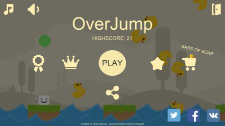 OverJump – занимательная инди игрушка на базе андроид, где именно ты будешь направлять мыло. В данном проекте ты окажешься в занимательном мире, где с неба падают в постоянном потоке уточки. Руководи квадратиком пахучего мыла и производи скачки, перемещаясь по платформам, если ты неправильно определись расстояние до иной платформы, то ты свалишься в воду и умрешь. Перепрыгивай все платформы и не пропускай представленных желтых уточек, которые будут помогать тебе раскрывать смешные мордашки, которые демонстрируют разносторонние эмоции для твоего куска мыла. Играй в данном проекте и весело проведи собственный досуг…