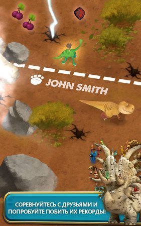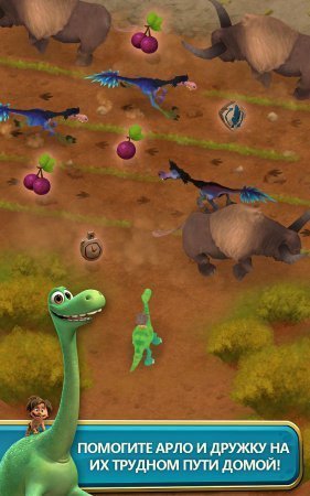 The Good Dinosaur – фантастическая официальная игрушка по сюжету одноименного такого же мультика Дисней. В данной игрушке ты познакомишься с добреньким динозавром которого звали Арло и небольшим парнем Спотом. В игрушке ты проследуешь в доисторический мирок, где руководят всем динозавры и будешь там стремиться выжить. Помоги динозавру и его товарищу пройти по страшным территориям как можно дальше и при этом уклонитесь от злостных птеродактилей и не дружелюбных динозавров, которые пожелают тебя скушать. Переходи реки, луга, обрывы и прочие преграды и копите фрукты и поощрения. Каждый новенький уровень порадует тебя разносторонним миром и не одним и шикарными бонусами.