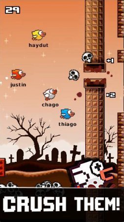 Flapping Crush: Halloween Bird – занятый тайм киллер на базе андроид, где ты будешь играть не за пролетающую птичку, а за перемещающуюся трубку. Жми на дисплей собственного устройства как можешь только дольше раз и не допусти того чтобы ни единая пташка не пролетела мимо тебя. Дергай трубу постоянно, когда птенчики будут проноситься мимо, устраняя их, ты будешь получать баллы. Твоя задача не упустить ни единой пташки. Испытай ловкость собственных пальцев на практике и поднимай собственный рейтинг, соперничая с собственными противниками. Преимущества – пара параметров игры, свыше семидесяти разно форматных птичек, графика в стареньком формате. Семь типов стен и разнообразные усиления, лидерская табличка и достижения.