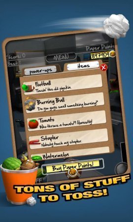 Paper Toss 2.0 на базе андроид теперь еще более привлекательная. Замечательная убивалка время ожидания в ней тебе важно попасть помятым комочком бумаги в коробку для мусора. Ко всему этому у тебя возникнет возможность поднимать собственные умения с бананами, бомбами и иными частичками. Веселья присоединяет тот факт, что масса офисных частиц может быть разгромлена. Игрушка не сохраняет русификацию.