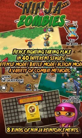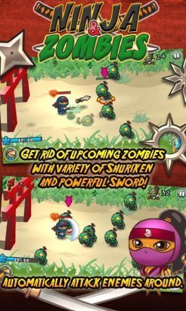 Ninja and Zombies -- проект на платформе андроид, в которой тебе необходимо руководить ниндзя и устранять зомби. Набери собственную команду ниндзя до восьми душ и устрани все злобу. Преимущества -- десяток разносторонних ниндзя, шесть разнообразных мечей, разнообразные типы одежды, восемь типов звезд, сорок ступеней, куча противников.
