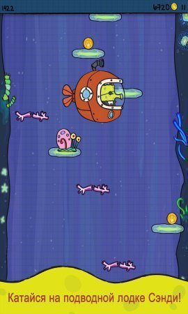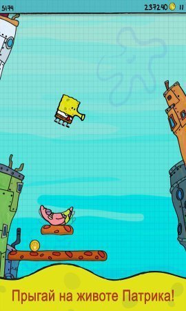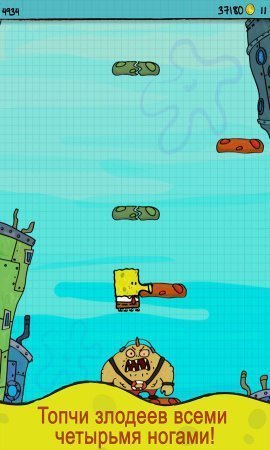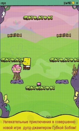 Doodle Jump SpongeBob -- студия Nickelodeon приняла решение поиграть с персонажами их произведений. Она собрала персонажа =проекта Doodle Jump и знаменитого Спанч Боба, и вышла очень занятная прыгалка на азе андроид. Тебе нужно будет скакать таким гибридным персонажем вверх, применяя разносторонние бонусы, к примеру, как надувные шары, либо батискаф. Все происходящее в больше степени происходит под водой, поэтому будь готов к подводным монстрам, и прочим опасностям. Игрушка не русифицирована.