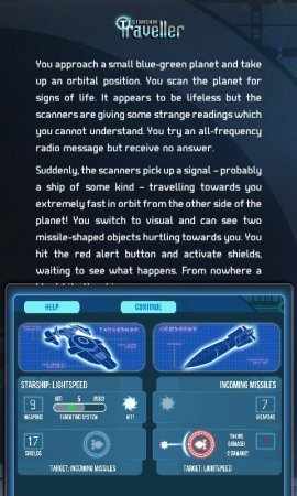 Starship Traveller -- очутившись в темной дыре твоя группа возникает в непонятной вселенной. Ты руководитель космического судна и судьба его и состав непосредственно в твоих руках. Удастся раскрыть для себя дорогу на землю. Играй и тогда ты точно все поймешь. Дорога будет лежать сквозь разноплановые цивилизации, так что приключения будут занятными. Преимущества -- шанс выставлять экипаж. Три формата сражения. Автоматическая демонстрация графика твоих перемещений сквозь космос. Новенькие планеты и звезды возникают, как только ты их отыщешь. Успехи по всему Gamebook.
