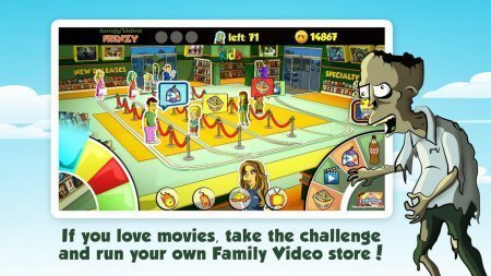 Family Video Frenzy такая себе аркадная игрушка на платформ android, в которой ты хозяин замечательного видеосалона и к тебе приходят разнообразные посетители с собственными запросами и требованиями. Удовлетвори всех посетителей, предоставив им непредсказуемый товар оперативно и главное качественно, для того чтобы все в результате были довольны. Тебе раскрыто -- сотня футуристических ступеней, шесть форматов игры. Эпические противостояния, BOSS Cool поощрения. Мега герои, зомби и прочие. Unlockable купоны. Интеграция с социальной сетью Facebook и монеток. Проект не владеет русификацией.