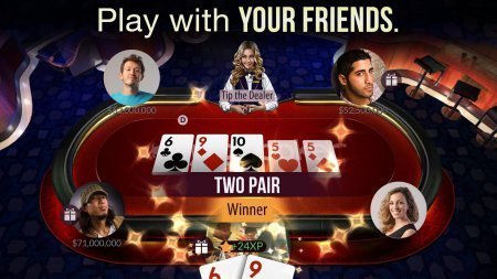 Zynga Poker – вечер, покер и бутылка виски, что еще нужно для счастья? Перед вами всеми давно знакомая игра с приятным интерфейсом и не менее качественной анимацией. Всё что вам нужно, это наличие интернета и ваше мастерство, ну или же доля удачи для приятной и не менее прибыльной игры. Заполняйте игровые столы исключительно друзьями, для выявление лучшего среди вас или же берите на блеф, если надоели понты ваших друзей. И помните, от новичка до чемпиона холдема лишь один шаг и этот шаг называется - Роял-флэш.