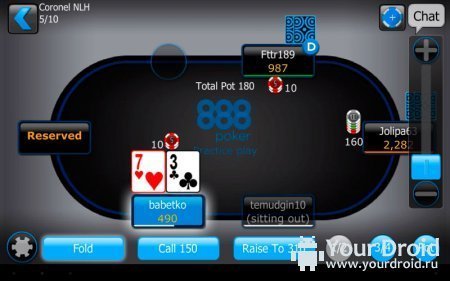 Если вы не представляете жизнь без покера, предложите коллегам партию с реальными ставками, риском и адреналином. Карточный имитатор Poker 888 для андроид на планшет, который можно скачать на андроид телефон на русском - это 20 комнат со столами, тысячи экспертов шулерского дела, турниры и рейтинговую таблицу. Завлекайте друзей и коллег игрой в техасский покер, блефуйте и наслаждайтесь выигрышем. Поставьте покер холдем в смартфон android, создайте команду, чтобы сыграть в турнире и победить.