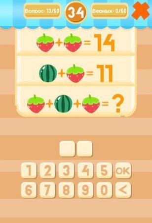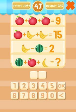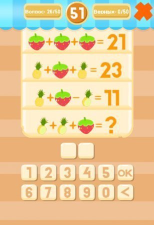 Fruit Math – игра представляет один из самых популярных жанров – головоломку. Вам придется поломать голову над сложными задачами. Вам предстоит решать примеры, которые представлены в виде фруктов. Решение записывать не нужно, а вот ответ должен быть правильным. Это игра будет интересна любому возрасту, ведь она помогает тренироваться быстрому счету в голове. Графика отличная, много вариаций заданий. Уровни не простые, поэтому готовьтесь напрягать свои извилины. Каждый уровень сложнее, чем был предыдущий. Русскоязычная версия игры имеется. Начните мозговой штурм, заставьте голову работать.