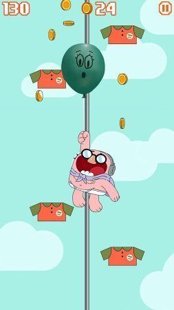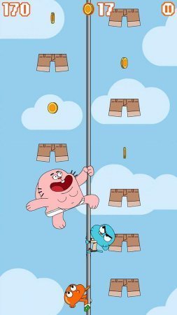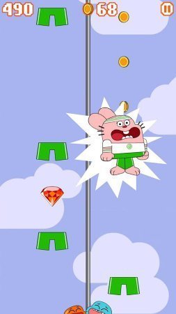Удивительный мир Гамбола – интересный американский мультипликационный сериал выпуска телевизионного канала Cartoon Network, во главе которого размещен Уоттерсоны, семья центрального персонажа. По ноткам данного мультика сериала компания Cartoon Network выпустила уже полный перечень проектов и каждый из них постоянно пользуется не малой известностью. Sky Streaker - Gumball – продвижении выпуска проектов про непоседливого героя котенка. В данный раз во главе сюжета разместился Ричард Уотерсон, который принял решение установить мировой рекорд по брожению без штанов, что само собой не сильно понравилось всем его членам семьи, так что для твоего рекорда будут серьезные помехи. Так вот сам процесс игры очень-таки прост, руководя героем твоя цель стремиться залезть, как только можно выше, при этом уходя от столкновения с представленными штанами и удирай от Гамбола. По дороги можно подбирать денежки, на которые потом можно купить улучшения и поощрения.