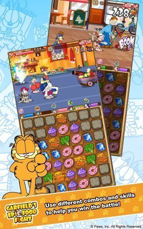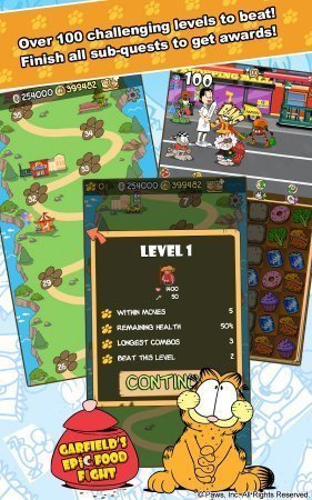 Гарфильд – скорее всего самый известный кот во всех местах, ну в США так точно. А получилась у него такая популярность из-за очень даже распространенной черты характера, простой лени, но при этом данному персонажу удалось так сказать возвести лень в абсолютно новенькую степень, непосредственно за это он и принял ступень самого ленивого котика. Гарфильд стал центральным персонажем мультипликационного сериала, полнометражного кино и полного ряда комиксов, ну само собой разработчики игр не стояли в стороне. Garfield's Epic Food Fight – красивая игрушка из серии три в рядок, по собственному геймплею которая напоминает нетленный хит Match 3 Quest. Все происходящее Garfield's Epic Food Fight начинаю происходить после того как вся пища в городке оказывается в масштабной опасности, в таком роде ситуации может совершить подвиг даже очень ленивый кот как наш. А твоя цель само собой помочь герою справиться с инопланетными захватчиками и вернуть пищу.