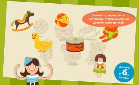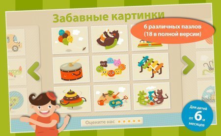 Пазлы для малышей -- интересная детская развивающая игрушка на платформе андроид. Игрушка восхитительно подходит для детишек, в ней красивые и крутые пазлы, которые способны разгадать детишки от шести месячного возраста. От картинки к картинке ступень сложности возрастает. Игрушка развивает у деток мелкую моторику. Образное и пространственное улучшение мышления чада, занимается работой памяти, помогает развитию возможное воображение, учат ребенка сосредоточится и воспринимать полные объекты сквозь частички. Детишкам будет занятно так как непосредственно пазлы вызывают у них серьезный интерес в таком возрасте. Преимущества -- пазлы разложены по ступеням сложности -- в начале это совсем просто потом уровень картинки по сложности повышается. Интересная графика питерского творца Паши Бумажного. Контуры изображения непосредственно будут помогать собрать твоему чаду все детали. Частички картинки разбиты на логические части, запчасти и частички. Авто сбор в течении минутки поможет очень маленьким пользователям понять всю сборку изображения. Интуитивно ясный ребенку игровой интерфейс. Покупки защищены от деток. Совершенно никакой не нужно рекламы.
