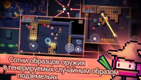 Геймплей в игре устроен тоже довольно интересно. Двигаться надо джойстиком, что сделан слева. Справа кнопки функционала – стрелять, прыгать и многое другое. А вот уровней в игре невероятное количество, кроме того, генерируются они случайным образом, поэтому на одну и ту же локацию никогда не попасть дважды. Постоянно происходит изменение видов и расположения ловушек, обитающих в локации монстров и залегающего оружия, каждый раз всё генерируется по новой.