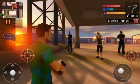 Miami Saints: Crime lords – захватывающая игрушка на андроид. Вам предстоит отвоевать у противника своё место под солнцем. И не где-нибудь, а в Майами. С помощью своего отважного героя вам придётся сразиться с мафией, которая держит ваш город. Создавайте свою империю, и смело боритесь против мафии. Уничтожайте бандитов, освобождайте город от криминала. Станьте конкурентом мафии, торгуйте контрафактным товаром, завозите контрабанду, подберите под себя важные стратегические объекты. Вступайте в разборки с бандитами, остановите мафию, угоняйте машины и уходите от полиции. В вашем арсенале доступно разное оружие. Участвуйте в перестрелках с мафией и полицией. Кто кого? В конце концов, станьте хозяином города. Всё должно работать на вас! проходите занятные миссии.