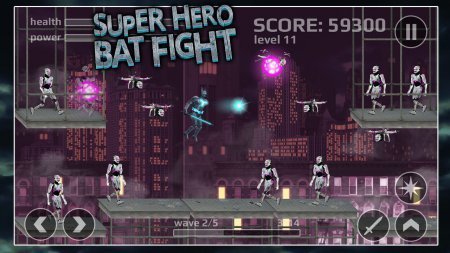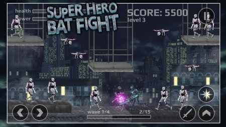 Superhero Bat Fight – это замечательный экшен для андроида в котором присутствуют элементы файтинга. Главный герой игры летучая мышь, которая должна спасти город от несметных полчищ врагов. Используйте лазерный меч для схваток, со злыми киборгами пытающихся уничтожить мирных жителей. Воспользуйтесь своими навыками ловкости для победы над врагом и освобождения города от зла. Помимо лазерного меча будут доступны энергетические шары, способные уничтожать врагов на большой дистанции. Своевременное пополнение здоровья и энергии поможет противостоять противнику и открыть новые уровни. Отсутствует русский язык.