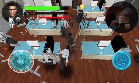 Office Worker Revenge 3D – интересный файтинг на системе андроид с широким перечнем орудия и противников. Все происходящее начинается в офисе. Тебя как всегда зовет начальник чтобы сделать выговор за не качественную работу. Ты выходишь из равновесия хватаешь что первое будет под рукой и начинаешь ломать все что только можно. На подмогу начальству пришла охрана. Но ты ясное дело понимаешь, что назад пути нет. Необходимо бороться до самого конца. В проекте имеется счетчик времени, непосредственно поэтому много не нужно расслабляться.