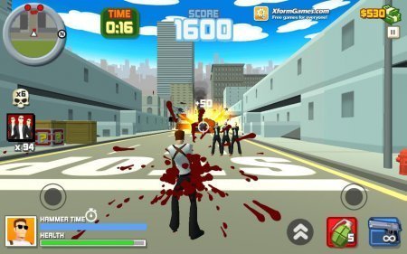 Hammer 2 – интересный экшен андроид, где ты будешь помогать смелому персонажу, зачищать улочки городка от неприятелей. Улочки данного городка усеяны противниками и плохой парень единственный кто способен с ними совладать самостоятельно и этой персонажи по имени Молот. Исполни свыше тридцати разносторонних задач, каждая из них принесет радость тебе новенькими противниками и сильным главарем и не одним. Устрани противников благодаря разносторонним орудиям, в этом же перечне используй подрывные вещества. По мере продвижения в проекте тебе будет раскрываться многочисленный список средств передвижения, к примеру, как танки, вертолеты, мотоциклы, машинки и не только. Прими массу успехов и соперничай с товарищами за самый высокий результат. А еще помни, что нужно побывать в магазине, где ты можешь купить удивительные вещи.