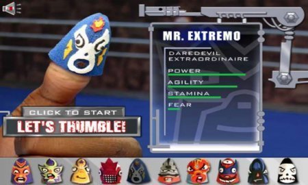 Thumb Arena – сильный реслинг возник очень давно и выступает шуточным представлением боев с непосредственным участием колоритных героев. Каждый имеет собственный шарм и фантастические навыки. Масса кто выбирал для себя персонажа, и не смотря на то что сражения были не настоящими, все же зрители усиленно болели за выбранного бойца. Судья на данном ринге по больше ступени был так сказать для антуража. Тебе запоминались красочные бои и неимоверные приемы, которые представляли герои. В такой шуточной игрушке которая направлена на шуточные драки тебе нужно бороться на пальцах, да это не опечатка на пальчиках. Манящий и не простой файтинг ожидает твоего персонажа.