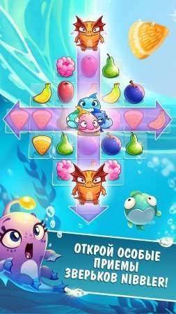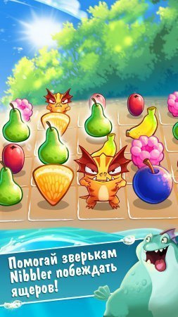 После неимоверного успеха самой первой части Angry Birds, создатель Rovio представил новую цепь игр на игровую тематику в том же списке и гонки, РПГ, аркаду казуального типа, но все эти проекты соединило одно, хорошо всем знакомые герои. Но похоже настал час изменить тематику и на смену не дружелюбным птицам пришли иные персонажи. Nibblers – казуальная игрушка аркада из образа три в ряд от все того же Rovio, главными героями в которой стали занимательные звери Nibblers. Слегка напоминающие рыбок, но которые едят только сочные и сладкие фруктики. Но как бывает даже у таких милых и безобидных зверьков всегда возьмутся недруги. Так произошло и в данный раз, компашка злющих ящеров совершенно не рада герои поедают их фруктики и стремятся мешать героям. Твоя цель помочь им собрать все возможные плоды, само собой, применив замечательные возможности.