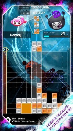 Тетрис – один из мега известных аркад за всю жизнь игрового процесса, за широкую жизнь игрушек было разработано сотни разносторонних аналогов и достойных копий, большая группа выступает просто клонами, но есть и достаточно интересные новые проекты. LUMINES PUZZLE AND MUSIC – отменная музыкальная аркада на основе механики старого доброго тетриса, но при этом разработчики довольно разнообразили сам геймпелй, поставили новую модную графику, высококачественную анимацию, и еще не мало важно нашли решение для установки саундтреков. Данная представленная игрушка понравиться как любителям стандартной аркады, ритм-аркады так и просто пользователям, которые любят интересно провести время. Создатели делают рекомендацию, что играть в наушниках круче.