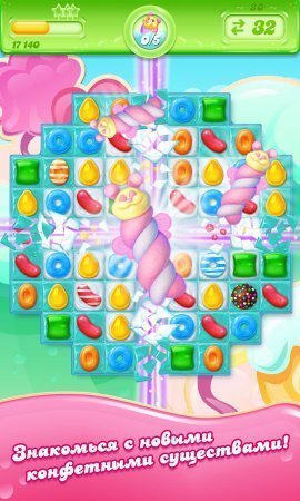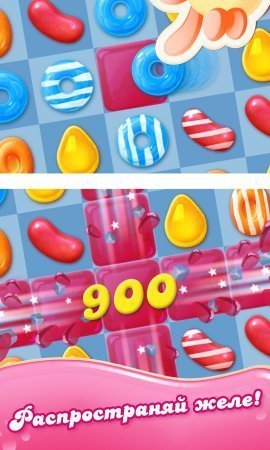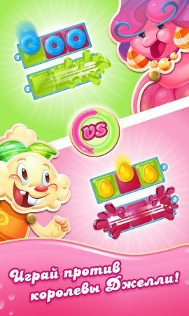Candy Crush Jelly Saga – занимательная игрушка на систему андроид, из облика три в ряд, в игрушке ты будешь противостоять такой себе желейной принцессе Джелли. Принцесса в один момент стала довольно сильной и для ее одоления, тебе будет необходимо серьезно постараться. Набери как можно больше желешек в ряд и не допусти чтоб принцесса одолела тебя, разместив на игровом поле своих желешек. Применяй в помощь себе разнообразные бонусы, а также бустеры, для достижения своей цели. Играйся сам либо с товарищами, занимая самые классные места в табличке достижений. Накажи принцессу желе и отдай все силы на то чтобы потратить малое количество ходов.