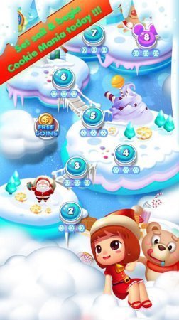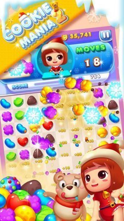 У игры Cookie Mania 2 очень яркая, красочная графика. Девочка Кукки приехала к Санта Клаусу и увидела Сладкие Острова. Белые острова выглядят как воздушные тортики с вафельными мостиками, облака из йогурта, сказочные пряничные домики. Всё это очень красиво. Нужно собирать по три одинаковых печенья в ряд и за это получать очки. За четыре собранных печенья можно получить волшебное печенье, которое уберёт из мармеладных ячеек сразу много печенья. За пять собранных печений, получают пирожное, которое уничтожит все печенья этого цвета, а вы получите ещё больше очков. На каждом уровне нужно получить три звезды. Каждый следующий новый уровень сложнее предыдущего. Игра не русифицирована.