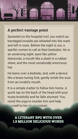 Действие игры Fallen London, происходит в Англии викторианского периода. Летучие мыши теперь правят бал. Игрок сам выбирает героя, за которого будет играть. Нужно последовательно выбирать. Описывается ситуация и предлагается сделать выбор. В зависимости от выбора, характеристики героя изменяется. Действие игры начинается в тюрьме. Потом нужно найти тайное убежище. И делая вылазки исследовать игровой мир. Нужно хорошо ориентироваться на местности и выполнять задания. Игра отличается тем, что в ней много текста. Но текст написан литературным хорошим языком. Очень качественная графика и лёгкое управление. Не русифицирована.
