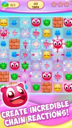Gummy Pop: Chain Reaction Game - кажется, что она такая же, как и множество других из серии логических головоломок по типу «3 в ряд». Но в реальности, она уже с начальных уровней поставит перед вами множество сложных интеллектуальных задач. Не думайте, что все ограничится простыми сборами одинаковых фигурок в ряды, на каждом уровне вас ждет все более сложное испытание, требующее большой сообразительности. Знайте, что даже победа на любом из уровней не гарантирует вам получение максимального количества баллов. Русский язык: не поддерживается. Интернет: не нужен.
