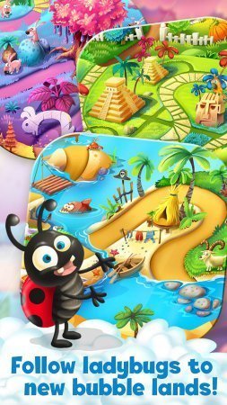 Bubble Buggie Pop – выстреливай цветными пузырьками в их е скопление в самом верху дисплея и подрывай пузырьки. Прицеливайся и выстреливай пузырьками таким образом, чтобы точно попасть в группку пузырей единого цвета. Твоей целью является очищение поля от всех представленных частичек на данном уровне, и получить при этом по максимуму баллов. Перемещайся по красочному миру и подружись с миленькими персонажами данного проекта, а конкретней паучком и божьей коровкой. Получи желаемые бонусы и используй их в не простых трудностях, чтобы поскорее преодолеть данный уровень. Установи рекорды и соперничай с самыми классными противниками данной занимательной игрушки. Игрушка увы не русифицирована.