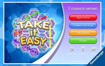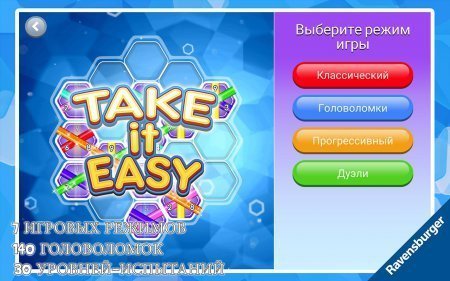 Take It Easy – игрушка для тех кто не прочь поработать головой. Геймплей Take It Easy включает в себя множество стандартных головоломок, несмотря на это создателям удалось сделать комплекс достаточно гармоничным. А вот механика данного проекта вышла с большими индивидуальными возможностями, которые нельзя наблюдать в популярных головоломках, преодоляя каждую из ступеней необходимо прорабатывать ситуацию и обдумывать каждый следующий шаг, что достаточно видно затрудняет долей случайности возникновение элементов. По мима всего создатели потрудились воплотить в Take It Easy целую цепочку игровых решений, от минимума, где вам предстоит узнать все мелочи геймплея, до самого трудного. В каждый режим входит большое количество ступеней, созданных в высококлассной графике. Также нужно вспомнить о режиме широкого профиля, в котором вам предоставляется возможность соревноваться с друзьями, а также с другими игроками. Игрушка не русифицирована.