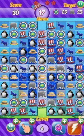 Race 2016 – помоги собственной партии победить в президентских выборах, в данной занимательной игрушке за тематики три в рядок. Собери цепочки из трех и выше символа собственной партии и собирай баллы на выборах. Используй все собственное логическое мышление и реакцию, для того чтобы качественно пройти предвыборную кампанию и собрат самое большое количество баллов, которые нужны будут тебе в гонке на выборах. Преодолевай занимательные задания и собери максимум что можешь по цепочке из символов. Сложность проекта будет медленно возрастать от этапа к этапу, тебе все куда сложнее будет собрать баллы. Примени подсказки и бонусы, чтобы преодолеть противников и оказаться на достойном месте в приготовленной таблице лидеров.