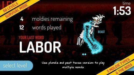 Moldicide занимательная игрушка головоломка на базе андроид, в которой тебе необходимо собирать слова и устранять зомби. Твоей основной задачей в этой игрушке будет складывать необходимые анаграммы и таким образом приведет в действие мощнейшее орудие для устранения зомби. Ты будешь находиться в определенном костюме, за бронированной дверцей раскрывая слова и активируя орудие, а зомби будут безжалостно прорываться к тебе. Тебя ожидает пара игровых режимов – первый режим легенды с эпическими приключениями и противостоянием зомби, второй режим направлен на выживание в нем у тебя будут более не простые задачи и указания. Раскрой все головоломки и спаси непосредственно весь мир от противных зомби.