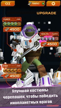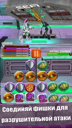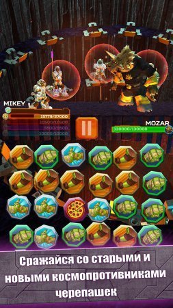 Компания создатель Nickelodeon широко знакома собственными непростыми решениями и занятными идеями. Но в данный раз создатели приняли решение, проследовать так выразится по накатанной тропе, взяв за основу линию сюжета из известного, когда, то мультипликационного шикарного сериала и не меньше известную механику занятной головоломки Match 3 Quest. Проекту дали прозвище TMNT: Battle Match или Черепашки - ниндзя: Космобитва. Как не сложно понят из указанного названия создатели оправили известную четверку в далекий космос. А еще тебе нужно понять широкие просторы и само собой бороться. Собирая последовательности фишек причине удары, победи в сражении, принимай баллы. А на полученные премиальные поднимай уровень самого персонажа, это в скорости очень тебе понадобится, так как противостояния с главарями черепашками будет производиться на пару и вот тут, то от тебя нужно будет тактическое распределение.