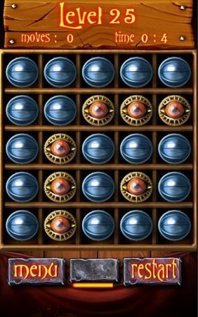 CloseEyesPuzzle привлекательная головоломка на базе андроид, исполнена на в мистической обработке, где основной твоей задачей будет закрыть все глазки. На поле есть раскрытые и закрытые глаза, и твоя цель непременно закрыть все глазки нажимая на них, в зависимости от их состояния, соседние частички будут либо открываться, либо же соврём наоборот. Для того чтобы преодолеть ступень закрой все глазки, если у тебя это не выйдет тогда нажми клавишу пропустить и переберись на дальнейшую ступень, но баллы тебе не зачислят. Старайся преодолеть все шестьдесят фантастических заданий и заслужить большое количество балов.