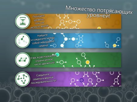 Dandelions: Chain of Seeds -- привлекательная головоломка на базе андроид, которая погрузит тебя в красивый мир молекул. Соедини их в верном направлении, для того чтобы вышла цельная нить на уровне. Тебя встретит шестьдесят интуитивных ступней в трех цветных мирах. Игрушка сохраняет не тяжелую графику, из-за этого она будет трудиться даже на очень слабых девайсах.