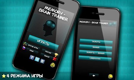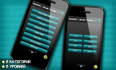 Memory - brain trainer -- проект который даст возможность усовершенствовать твое внимание и память. В проекте парочка игровых режимов, каждый из них направлен на развитие конкретного умения, к примеру, на память либо мышление. Преимущества -- четыре игровых режимов, восемь категорий карточек -- мультики, знаменитости, дорожные ограничения, флаги, звери, фрукты и прочее. Восемь ступеней сложности. Многопользовательский формат. Ведущая табличка, интуитивно ясный интерфейс, подсчет результатов баллы и время. Красочная графика подходит для деток и их родителей.